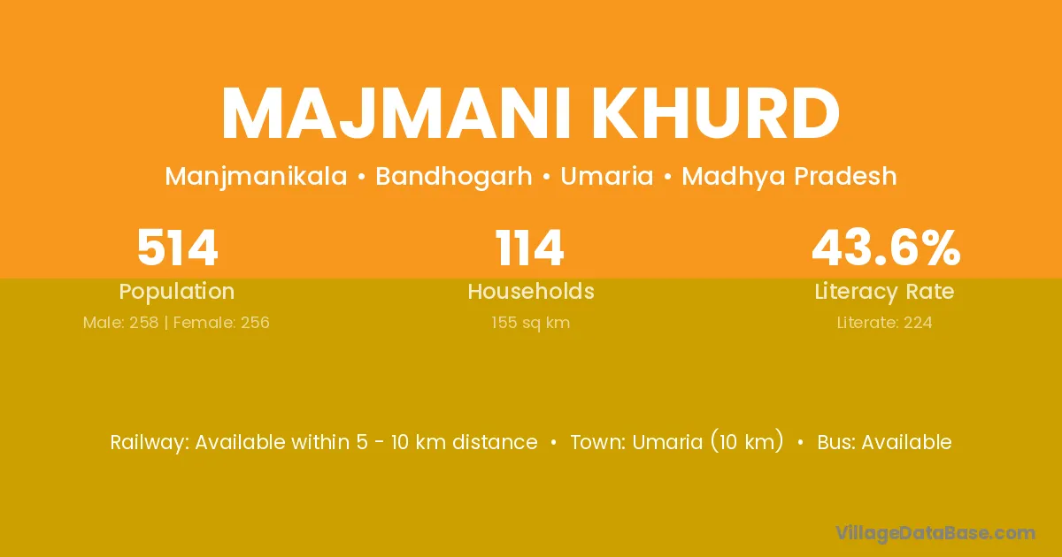 Umaria (10 km) is the nearest town to Majmani Khurd village for major economic activities and is located approximately 10 km away.