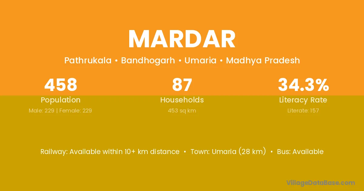 Umaria (28 km) is the nearest town to Mardar village for major economic activities and is located approximately 28 km away.