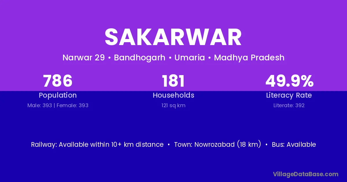 Sakarwar village has a total population of 786 people, of which 393 are males and 393 are females.