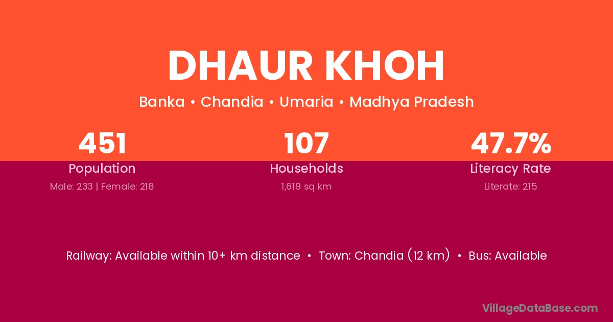 Dhaur Khoh village has a total population of 451 people, of which 233 are males and 218 are females.