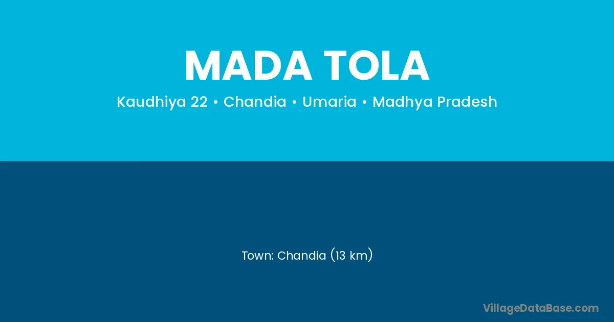 Chandia (13 km) is the nearest town to Mada Tola village for major economic activities and is located approximately 13 km away.