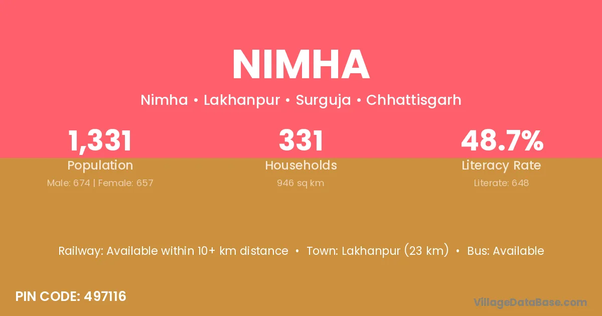 Umaria (25 km) is the nearest town to Nimha village for major economic activities and is located approximately 25 km away.