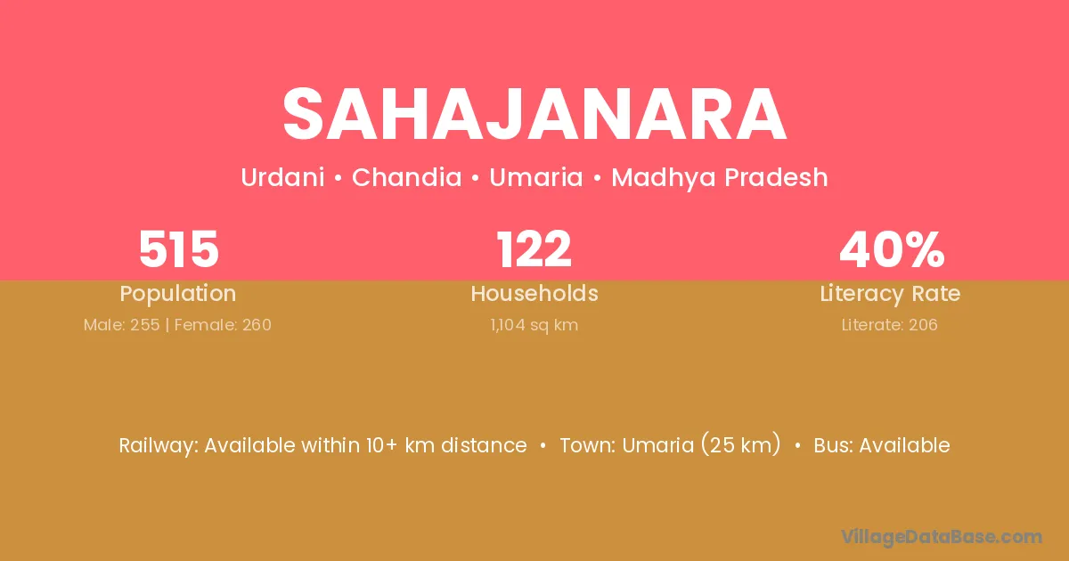Umaria (25 km) is the nearest town to Sahajanara village for major economic activities and is located approximately 25 km away.