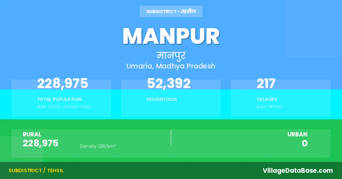 According to the 2011 census The total area of Manpur Tehsil is 1787 km², with a population of 228975 people. The population density is 128 inhabitants per square kilometre, and there are approximately 52392 houses in the sub district.