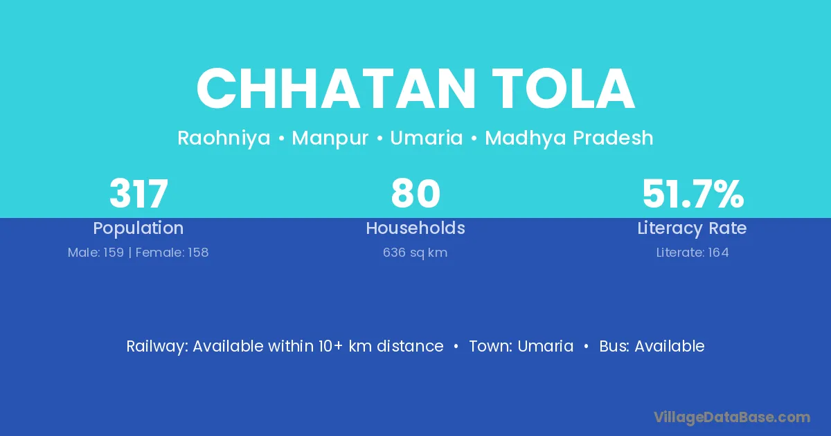 Chhatan Tola village has a total population of 317 people, of which 159 are males and 158 are females.