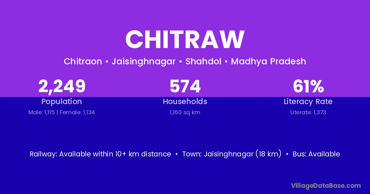 Umaria (70 km) is the nearest town to Chitraw village for major economic activities and is located approximately 70 km away.