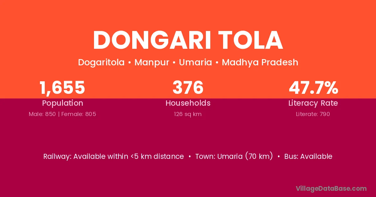 Umaria (70 km) is the nearest town to Dongari Tola village for major economic activities and is located approximately 70 km away.