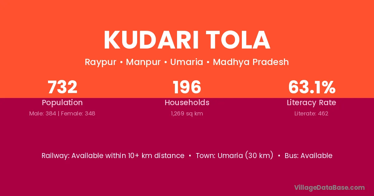 Umaria (30 km) is the nearest town to Kudari Tola village for major economic activities and is located approximately 30 km away.