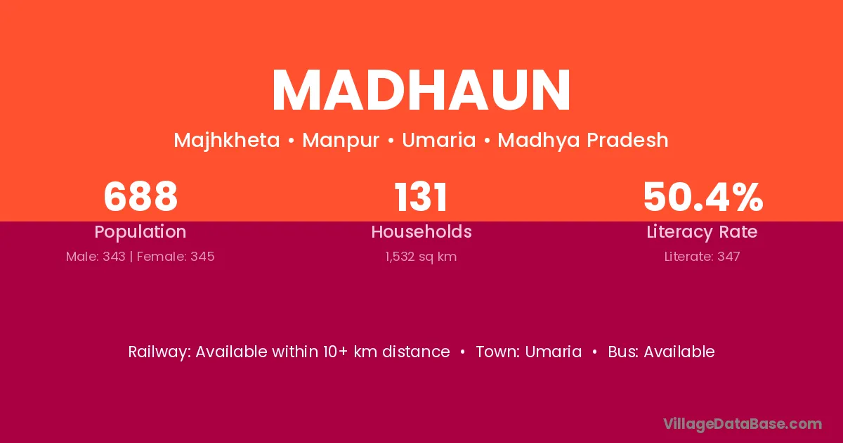 Madhaun village has a total population of 688 people, of which 343 are males and 345 are females.