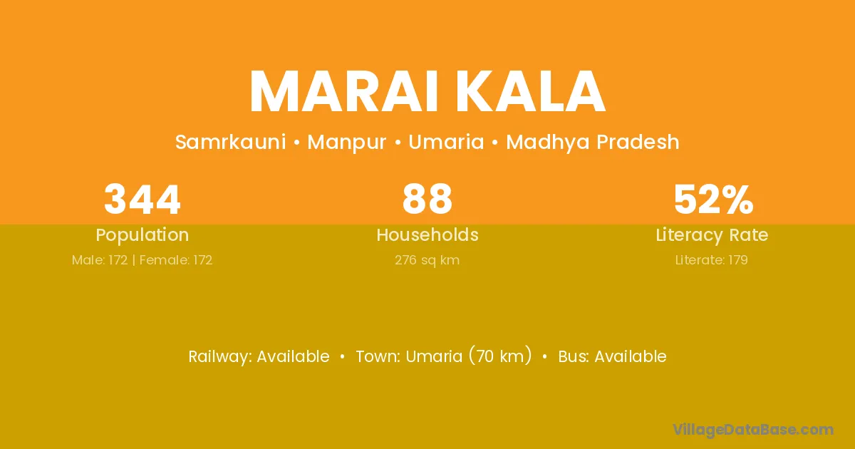 Umaria (70 km) is the nearest town to Marai Kala village for major economic activities and is located approximately 70 km away.