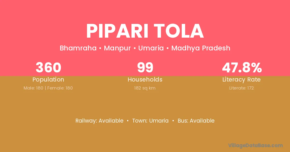 Pipari Tola village has a total population of 360 people, of which 180 are males and 180 are females.