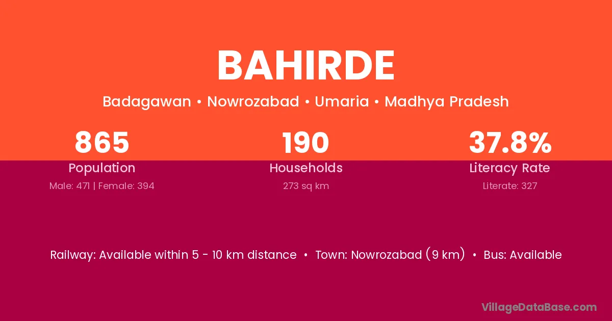 Nowrozabad (9 km) is the nearest town to Bahirde village for major economic activities and is located approximately 9 km away.