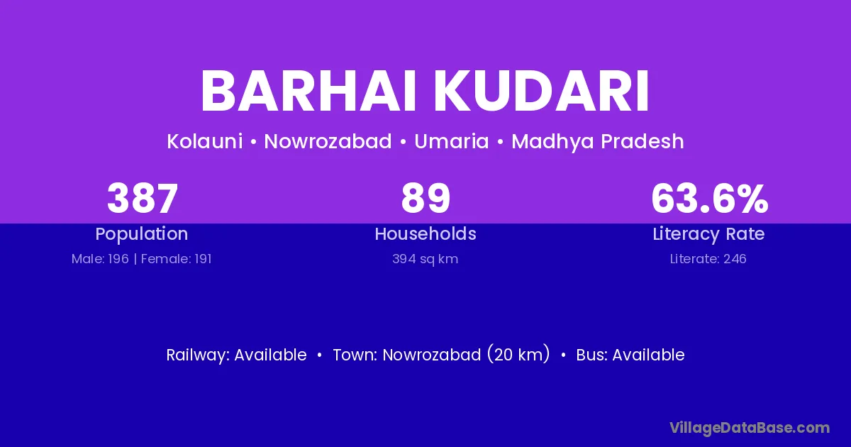 Barhai Kudari village has a total population of 387 people, of which 196 are males and 191 are females.