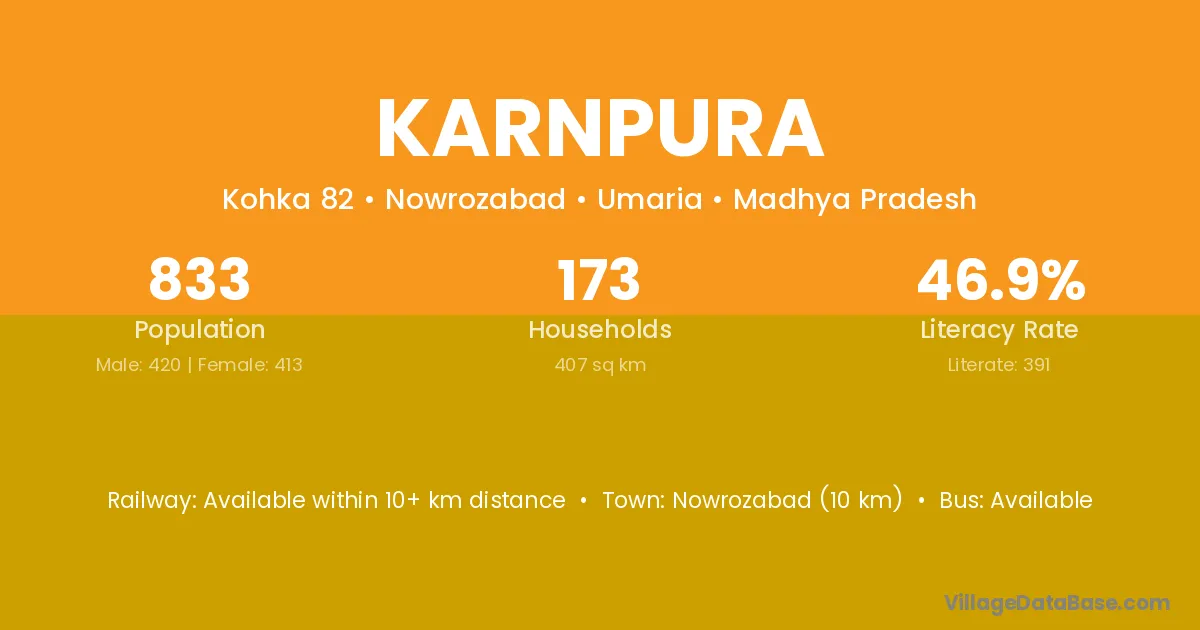 Nowrozabad (10 km) is the nearest town to Karnpura village for major economic activities and is located approximately 10 km away.