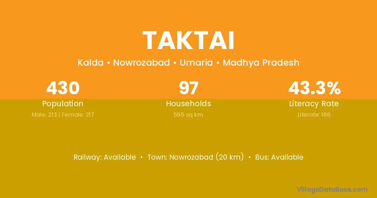 Nowrozabad (20 km) is the nearest town to Taktai village for major economic activities and is located approximately 20 km away.