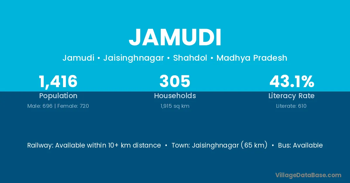 Shahdol (20 km) is the nearest town to Jamudi village for major economic activities and is located approximately 20 km away.