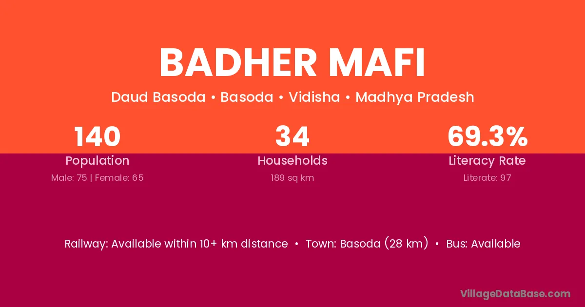 Basoda (28 km) is the nearest town to Badher Mafi village for major economic activities and is located approximately 28 km away.