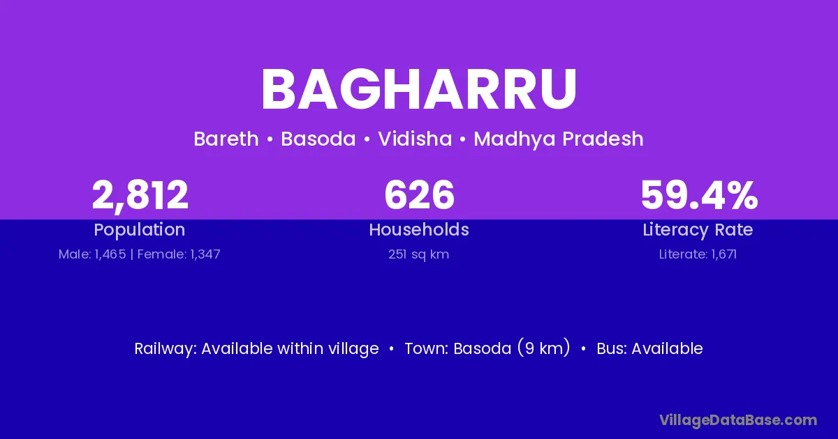 Basoda (9 km) is the nearest town to Bagharru village for major economic activities and is located approximately 9 km away.