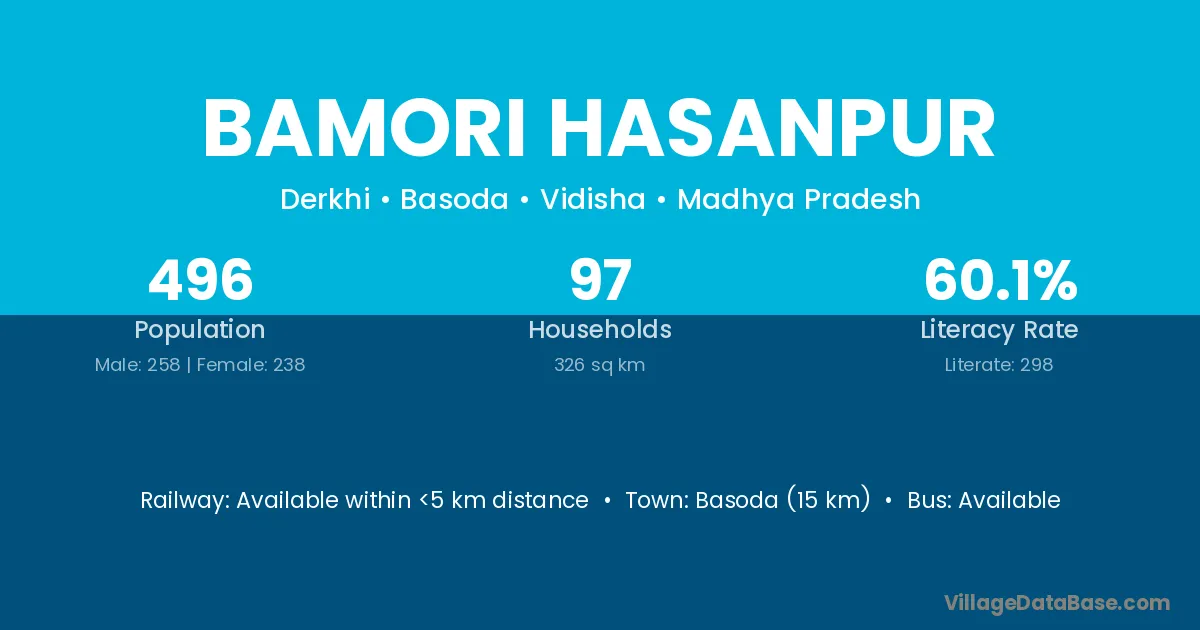 Basoda (15 km) is the nearest town to Bamori Hasanpur village for major economic activities and is located approximately 15 km away.