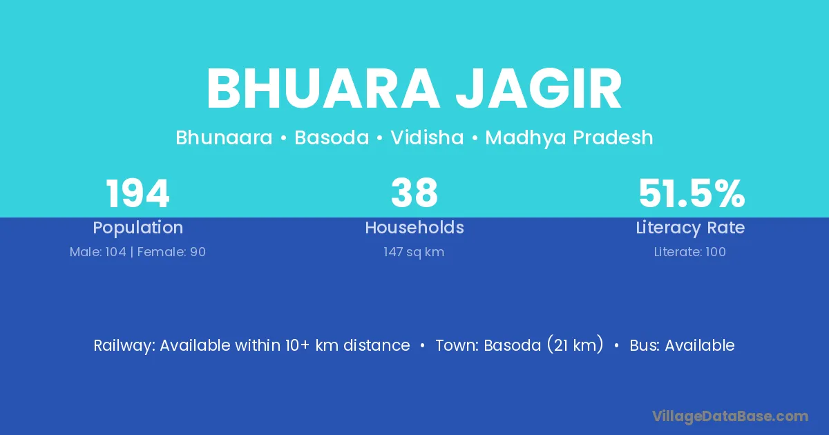 Basoda (21 km) is the nearest town to Bhuara Jagir village for major economic activities and is located approximately 21 km away.