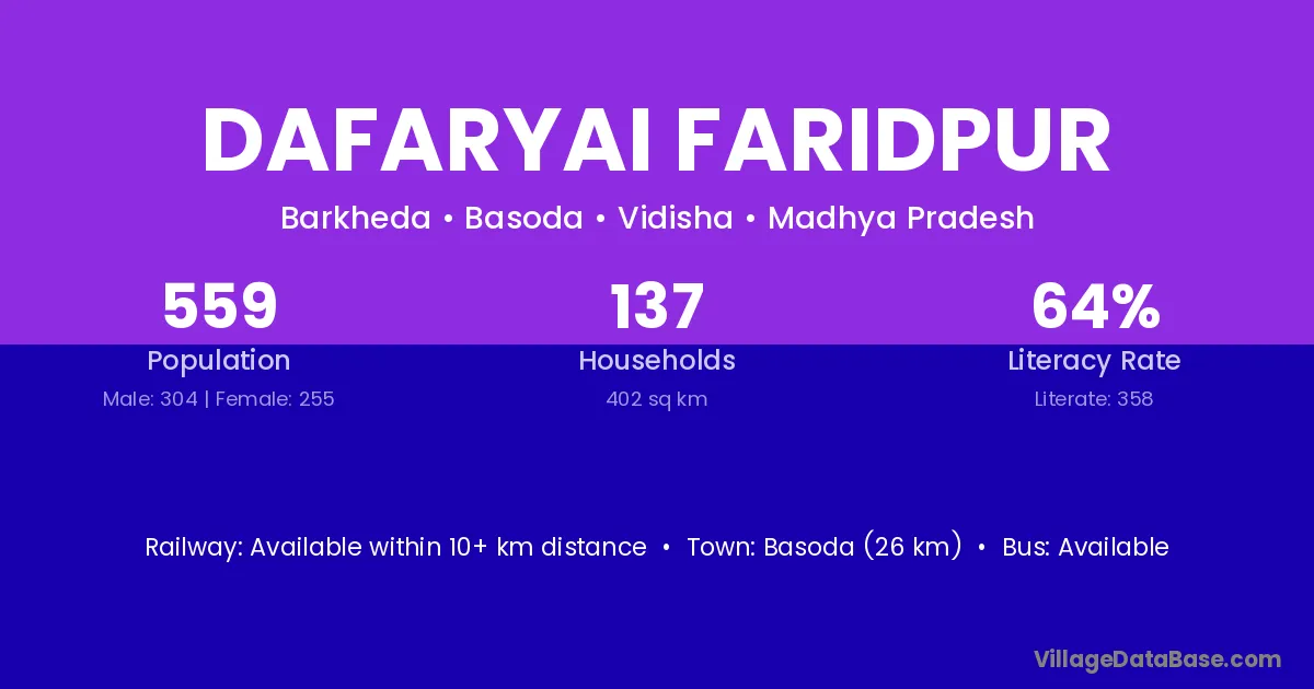 Basoda (26 km) is the nearest town to Dafaryai Faridpur village for major economic activities and is located approximately 26 km away.