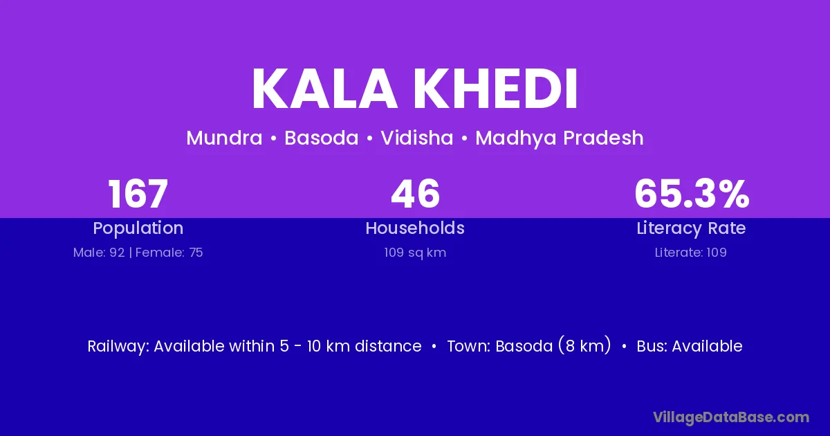 Basoda (8 km) is the nearest town to Kala Khedi village for major economic activities and is located approximately 8 km away.