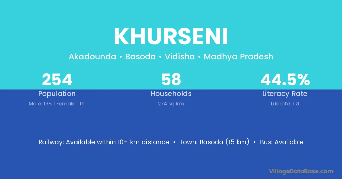 Basoda (15 km) is the nearest town to Khurseni village for major economic activities and is located approximately 15 km away.