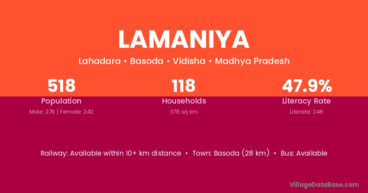 Basoda (28 km) is the nearest town to Lamaniya village for major economic activities and is located approximately 28 km away.
