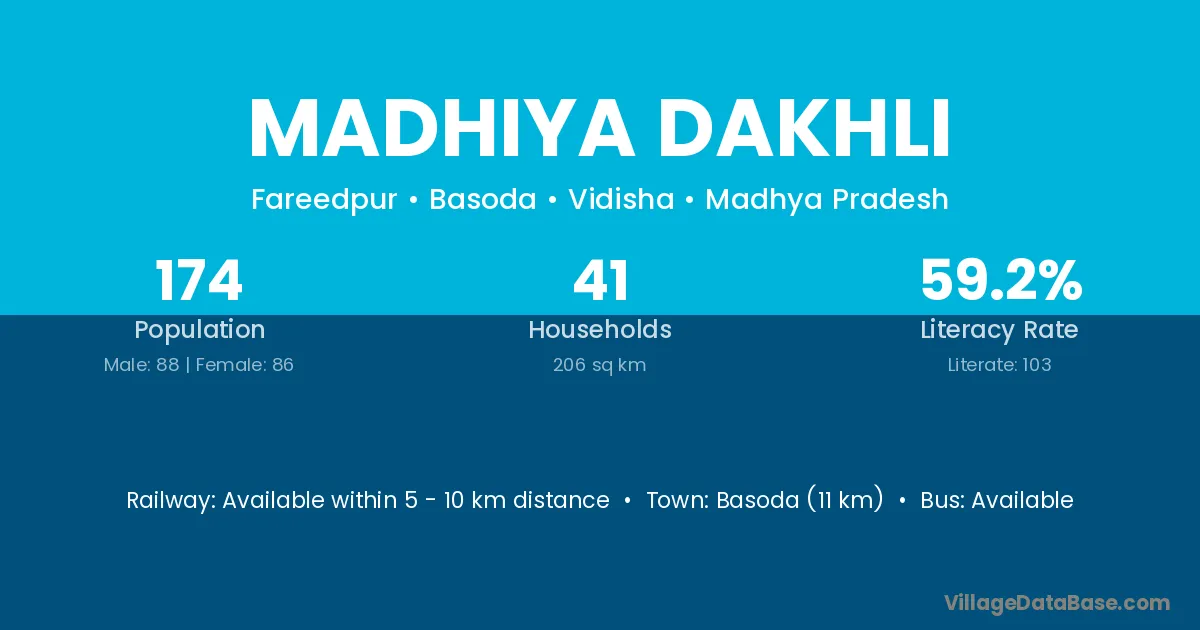 Basoda (11 km) is the nearest town to Madhiya Dakhli village for major economic activities and is located approximately 11 km away.