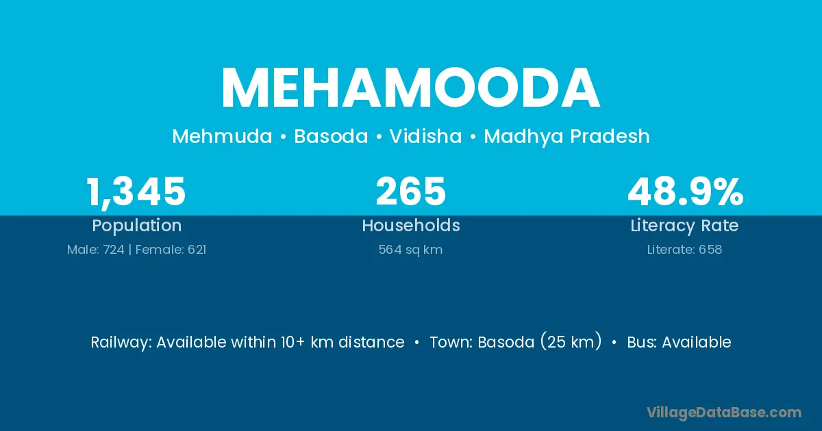 Basoda (25 km) is the nearest town to Mehamooda village for major economic activities and is located approximately 25 km away.