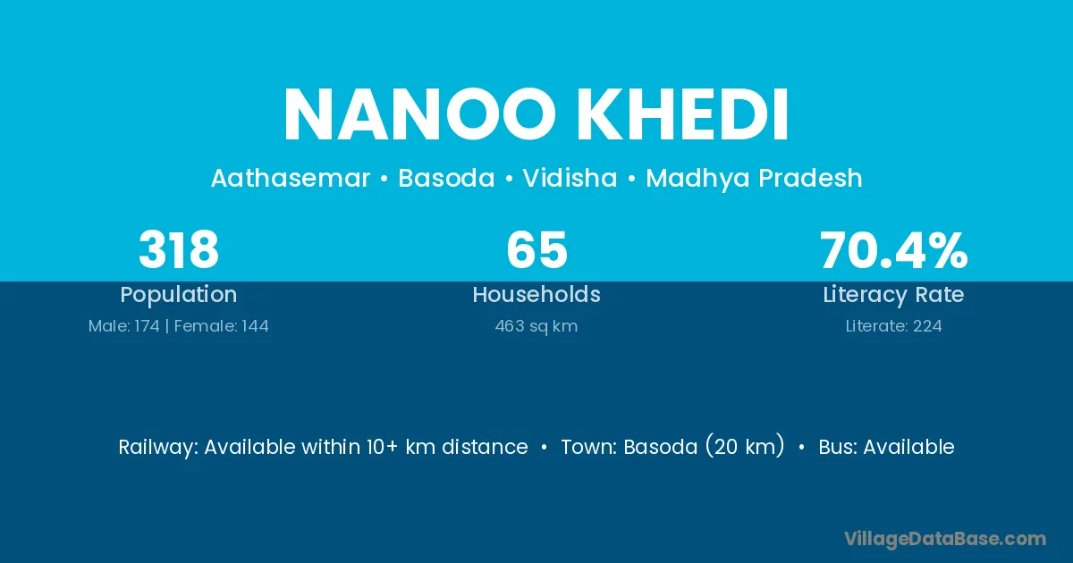 Basoda (20 km) is the nearest town to Nanoo Khedi village for major economic activities and is located approximately 20 km away.