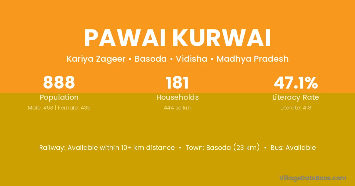 Basoda (23 km) is the nearest town to Pawai Kurwai village for major economic activities and is located approximately 23 km away.