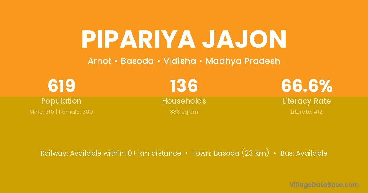 Basoda (23 km) is the nearest town to Pipariya Jajon village for major economic activities and is located approximately 23 km away.