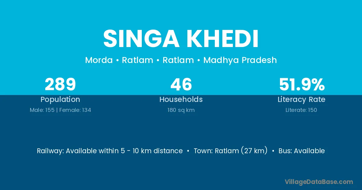 Singa Khedi village has a total population of 152 people, of which 80 are males and 72 are females.