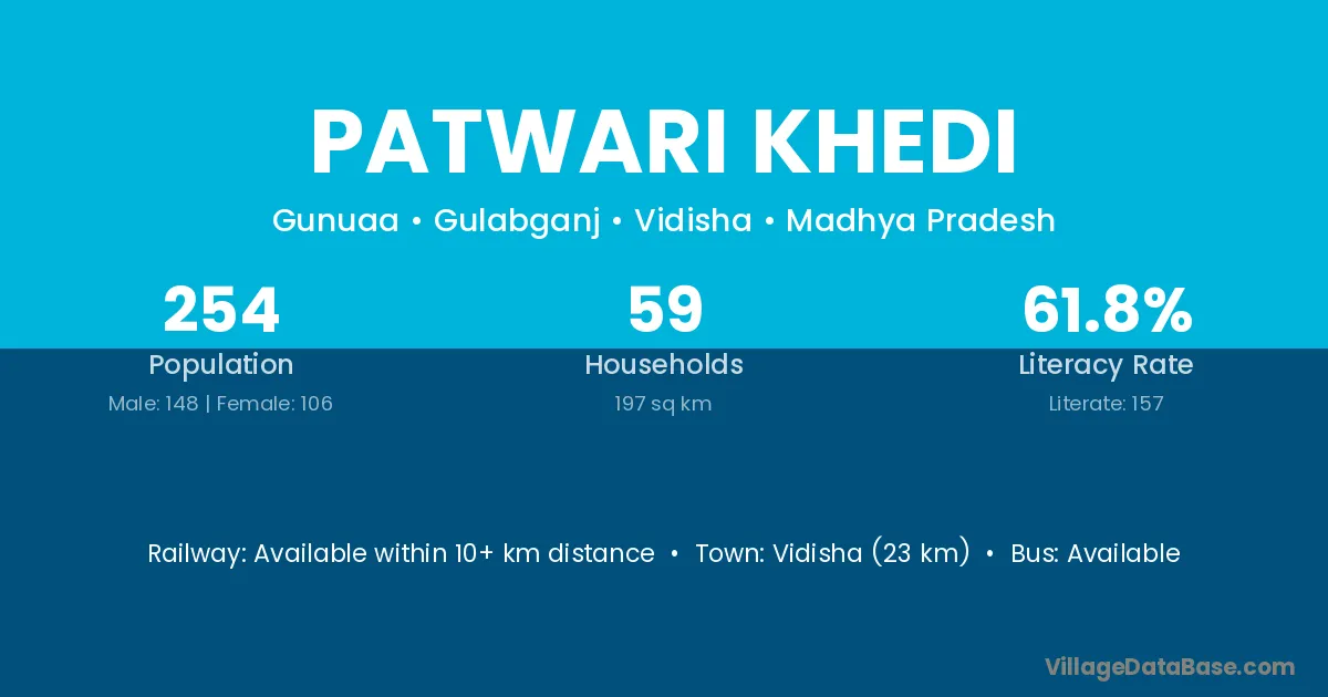 Vidisha (23 km) is the nearest town to Patwari Khedi village for major economic activities and is located approximately 23 km away.