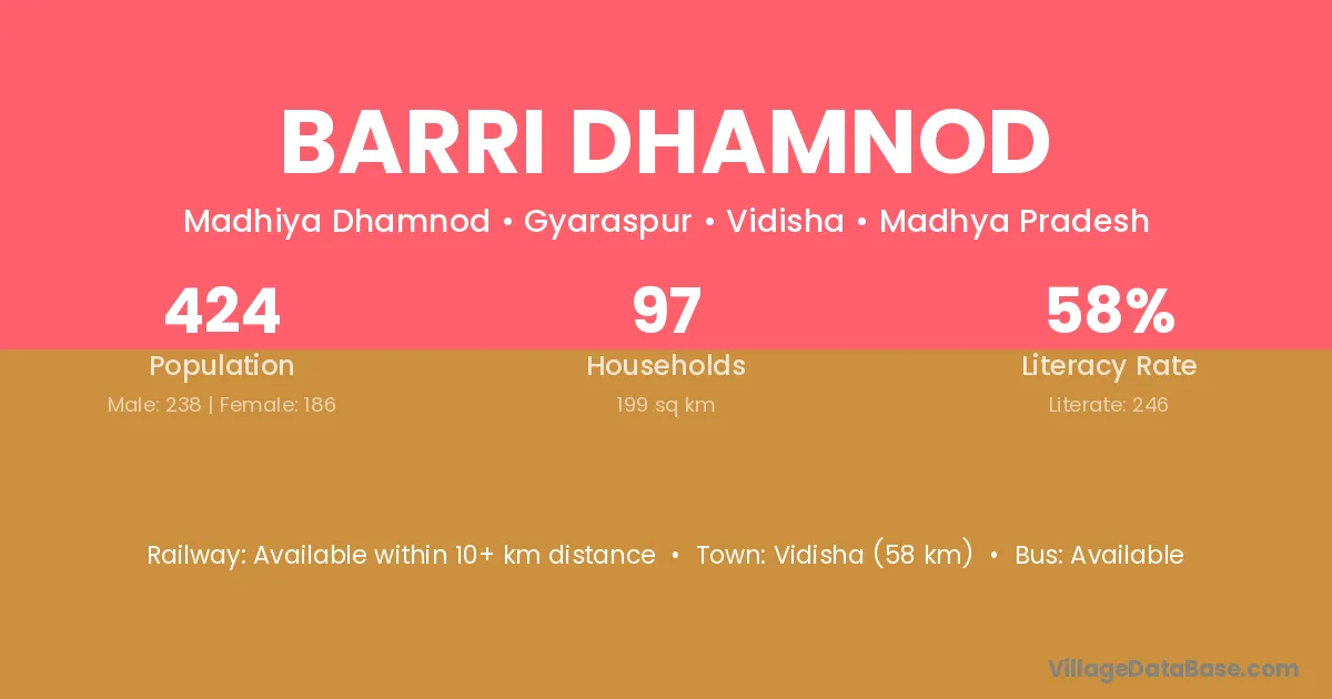 Vidisha (58 km) is the nearest town to Barri Dhamnod village for major economic activities and is located approximately 58 km away.