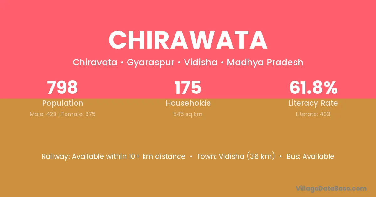 Vidisha (36 km) is the nearest town to Chirawata village for major economic activities and is located approximately 36 km away.