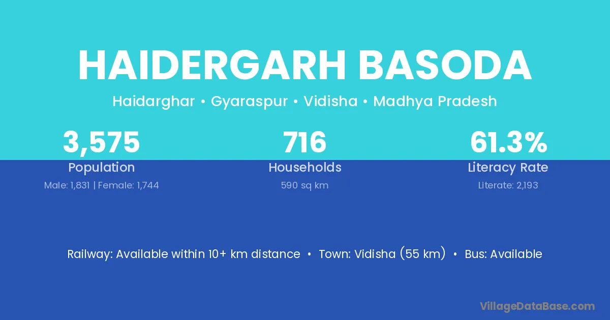 Vidisha (55 km) is the nearest town to Haidergarh Basoda village for major economic activities and is located approximately 55 km away.