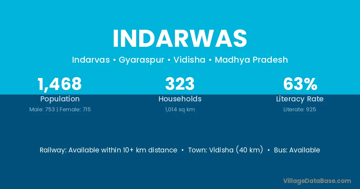 Vidisha (40 km) is the nearest town to Indarwas village for major economic activities and is located approximately 40 km away.