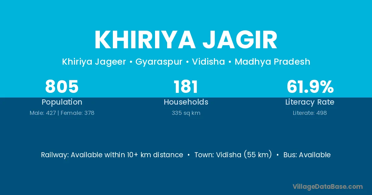 Vidisha (55 km) is the nearest town to Khiriya Jagir village for major economic activities and is located approximately 55 km away.