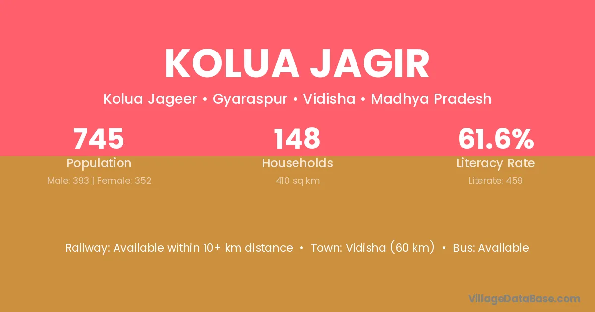 Vidisha (60 km) is the nearest town to Kolua Jagir village for major economic activities and is located approximately 60 km away.