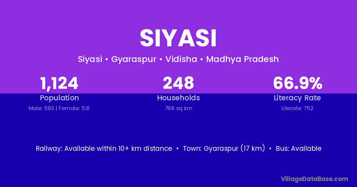 Gyaraspur (17 km) is the nearest town to Siyasi village for major economic activities and is located approximately 17 km away.