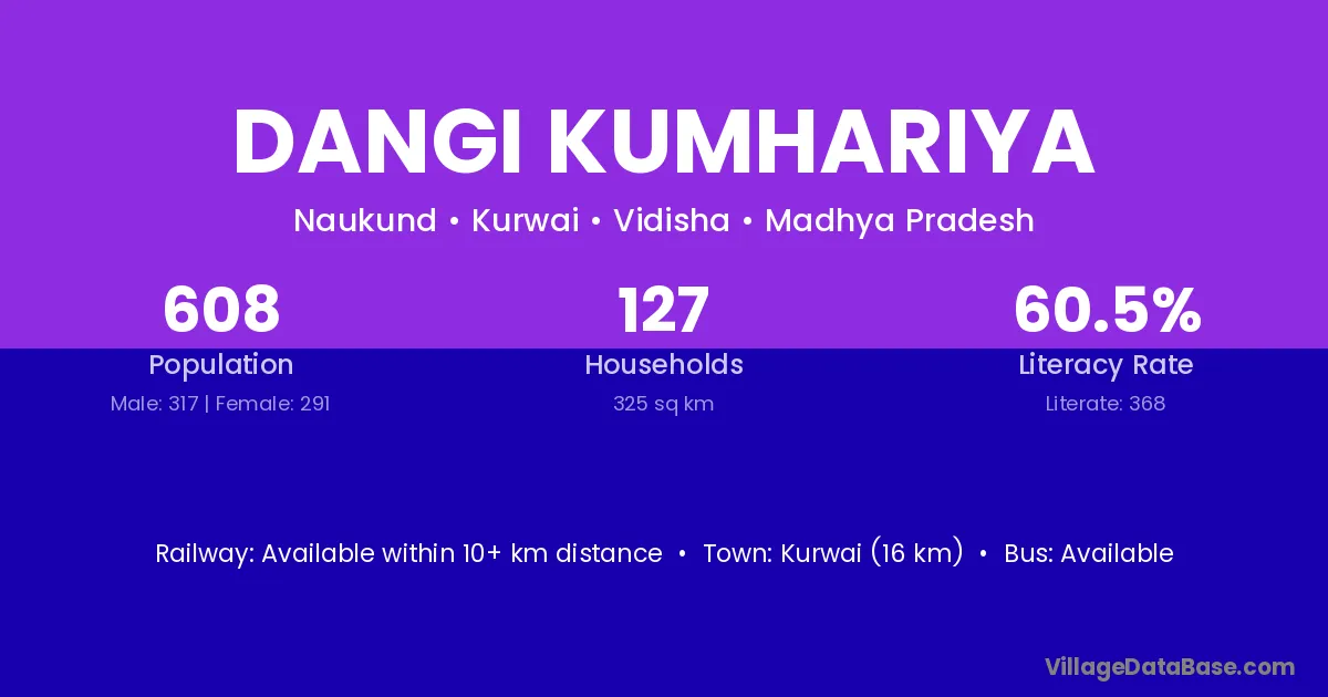 Kurwai (16 km) is the nearest town to Dangi Kumhariya village for major economic activities and is located approximately 16 km away.