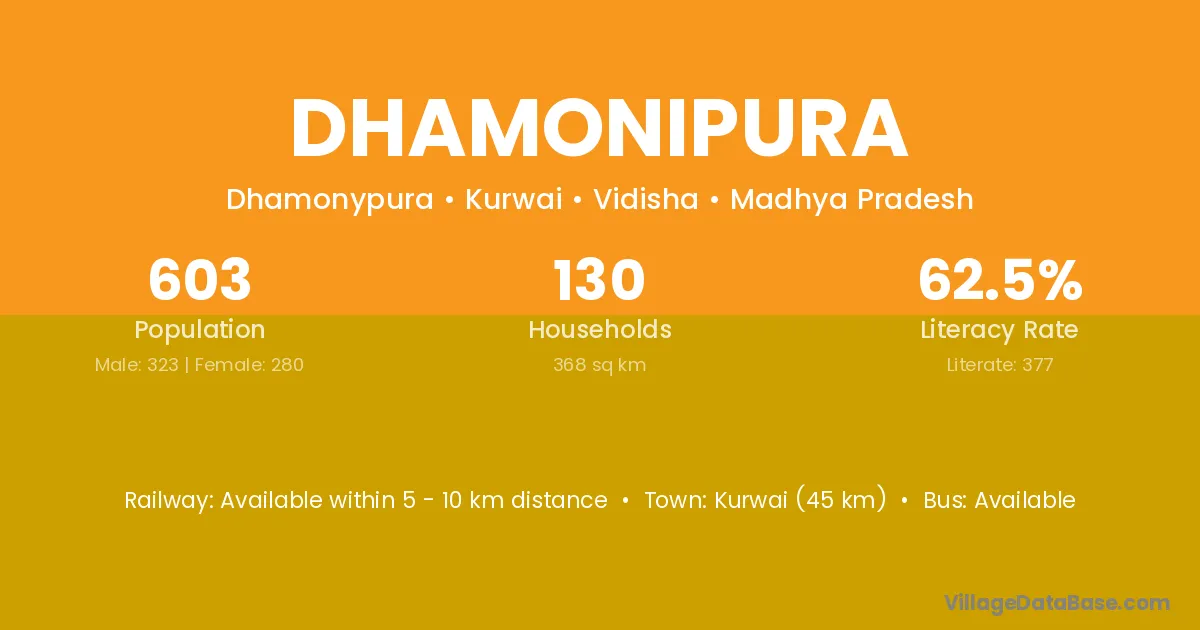 Kurwai (45 km) is the nearest town to Dhamonipura village for major economic activities and is located approximately 45 km away.