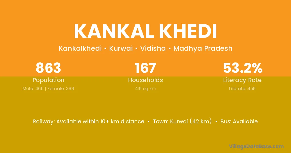 Kurwai (42 km) is the nearest town to Kankal Khedi village for major economic activities and is located approximately 42 km away.