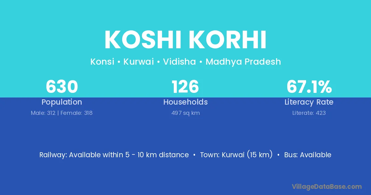 Kurwai (15 km) is the nearest town to Koshi Korhi village for major economic activities and is located approximately 15 km away.