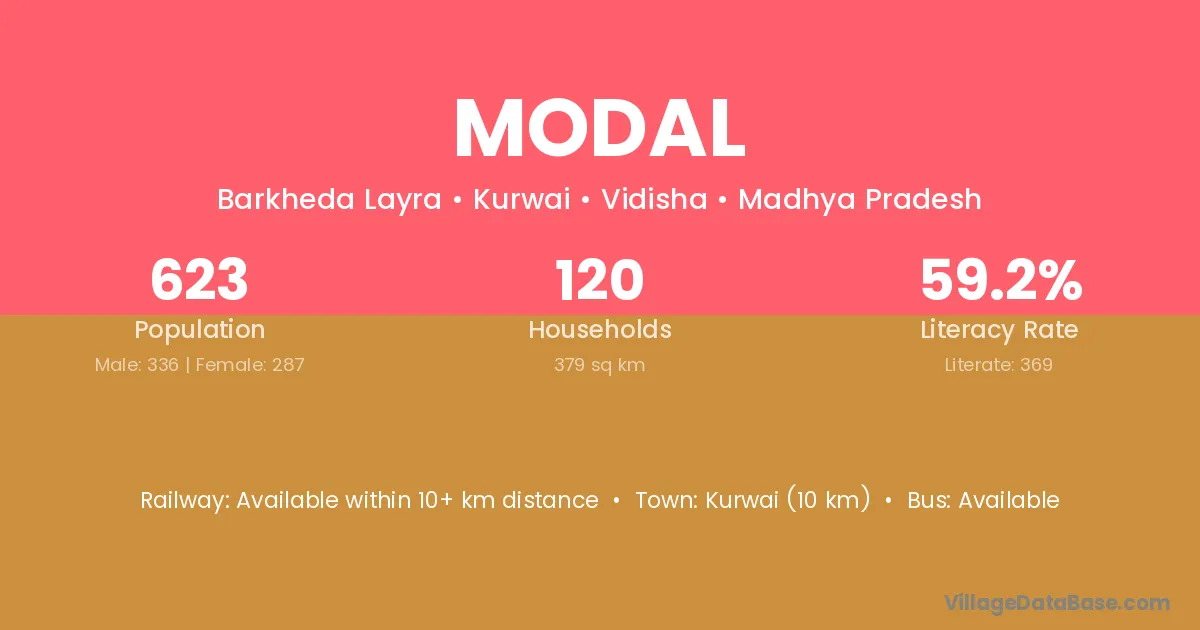 Kurwai (10 km) is the nearest town to Modal village for major economic activities and is located approximately 10 km away.