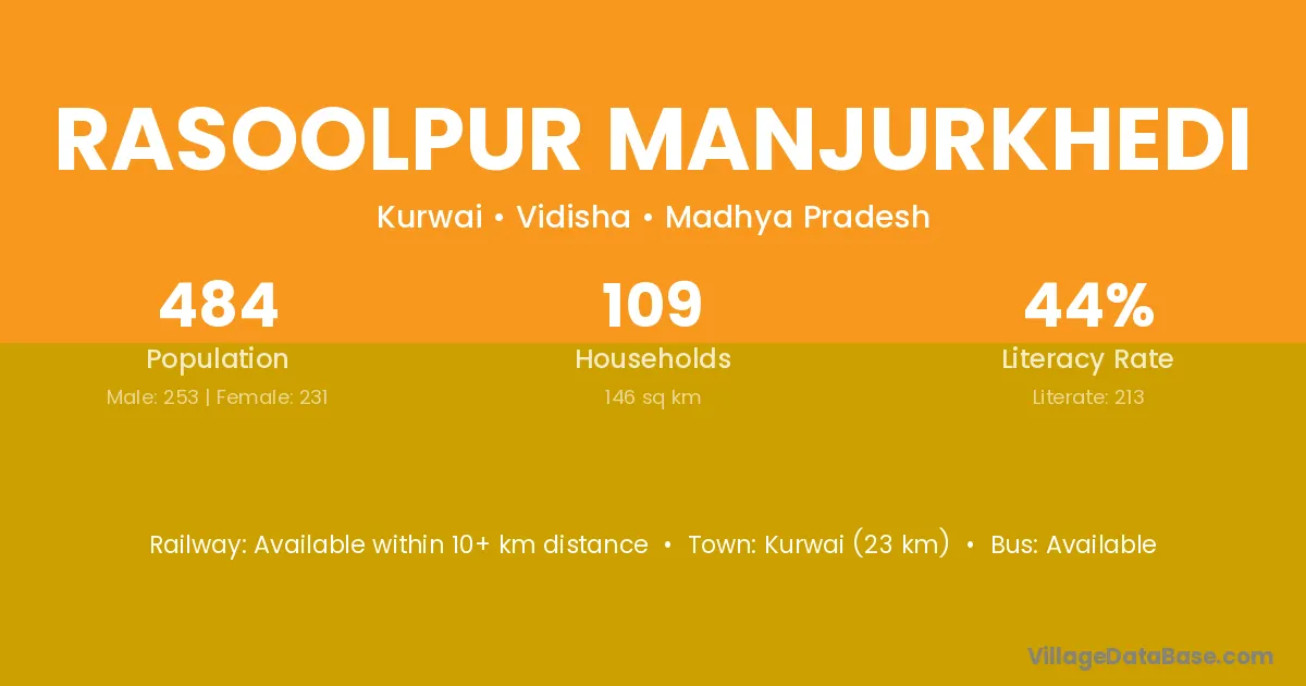 Rasoolpur Manjurkhedi village has a total population of 484 people, of which 253 are males and 231 are females.