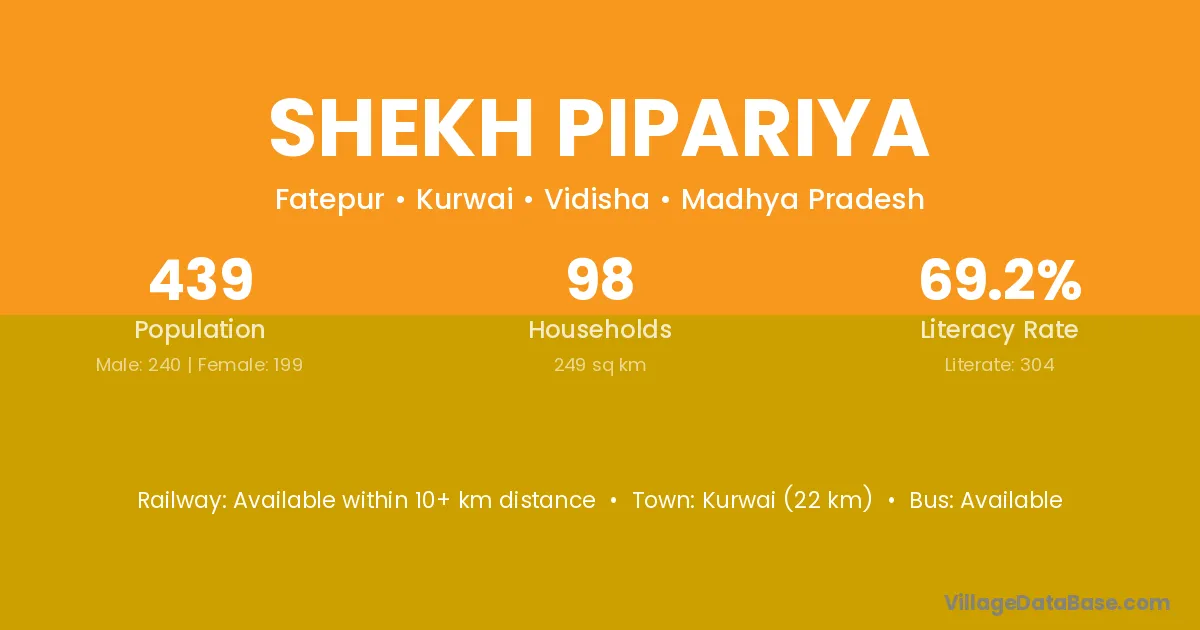 Kurwai (22 km) is the nearest town to Shekh Pipariya village for major economic activities and is located approximately 22 km away.