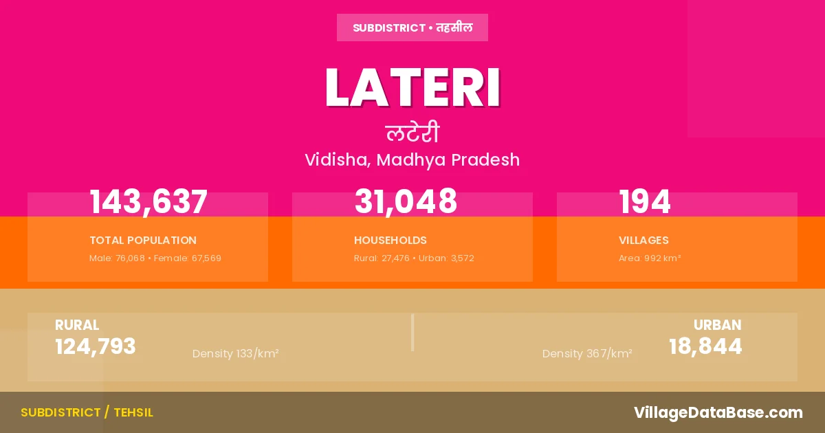 According to the 2011 census The total area of Lateri Tehsil is 992 km², with a population of 143637 people. The population density is 145 inhabitants per square kilometre, and there are approximately 31048 houses in the sub district.